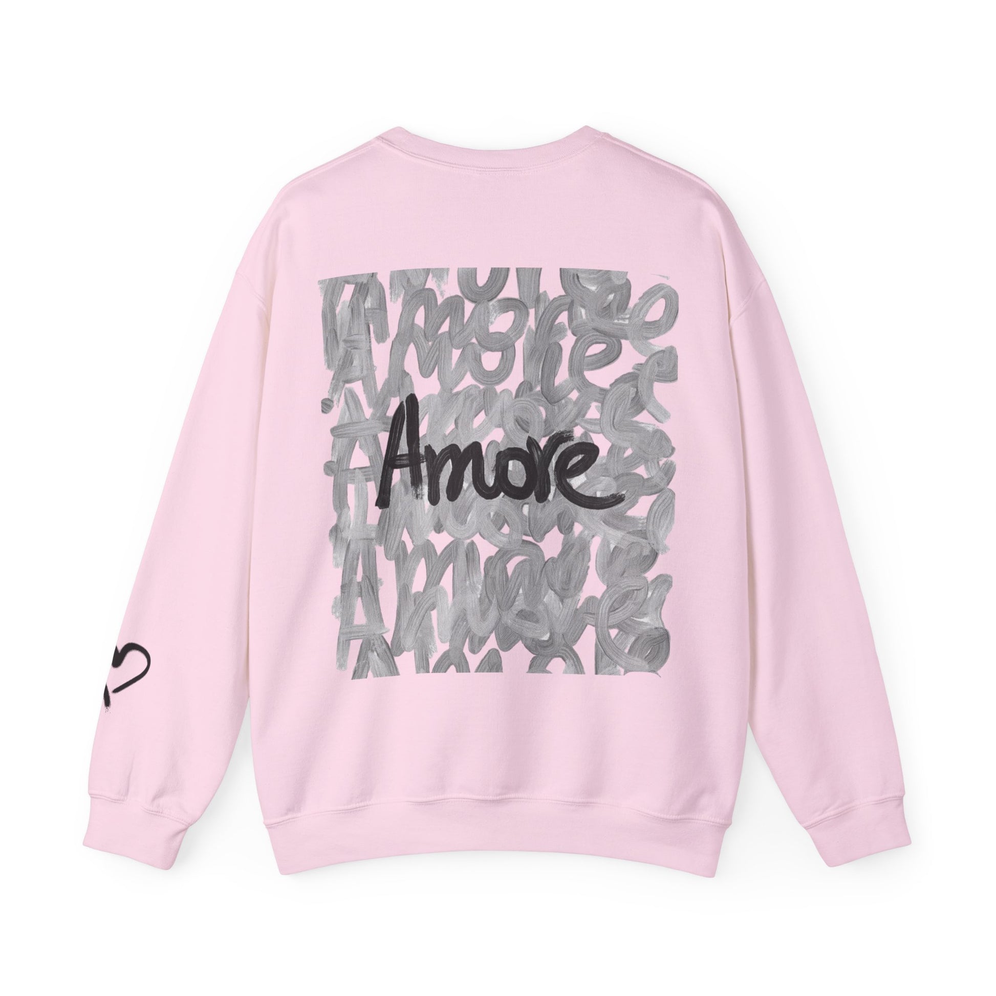 A soft, lived-in crewneck with a quiet, artistic voice. The slightly oversized silhouette drapes easily over layers, while the medium-heavy cotton-poly blend gives it that warm, broken-in feel you reach for on slow mornings. A hand-painted square of gray brushstrokes fills the back, overlaid with a single, handwritten “Amore” that reads like a note left on a café table. A small, matching heart mark on the sleeve keeps the design intimate when you turn a corner. Wear it to slow walks, gallery nights, or when you want your outfit to feel like a personal message.