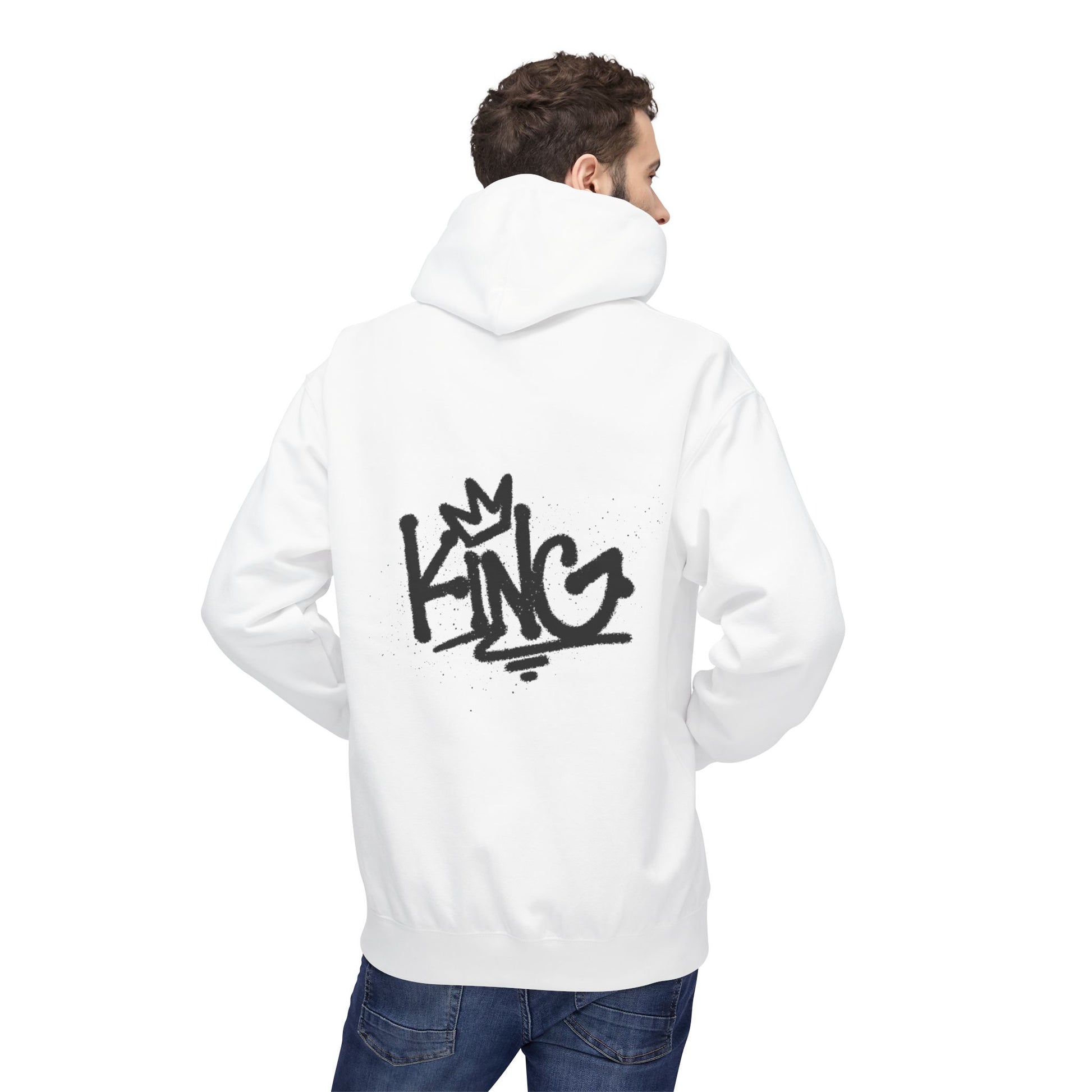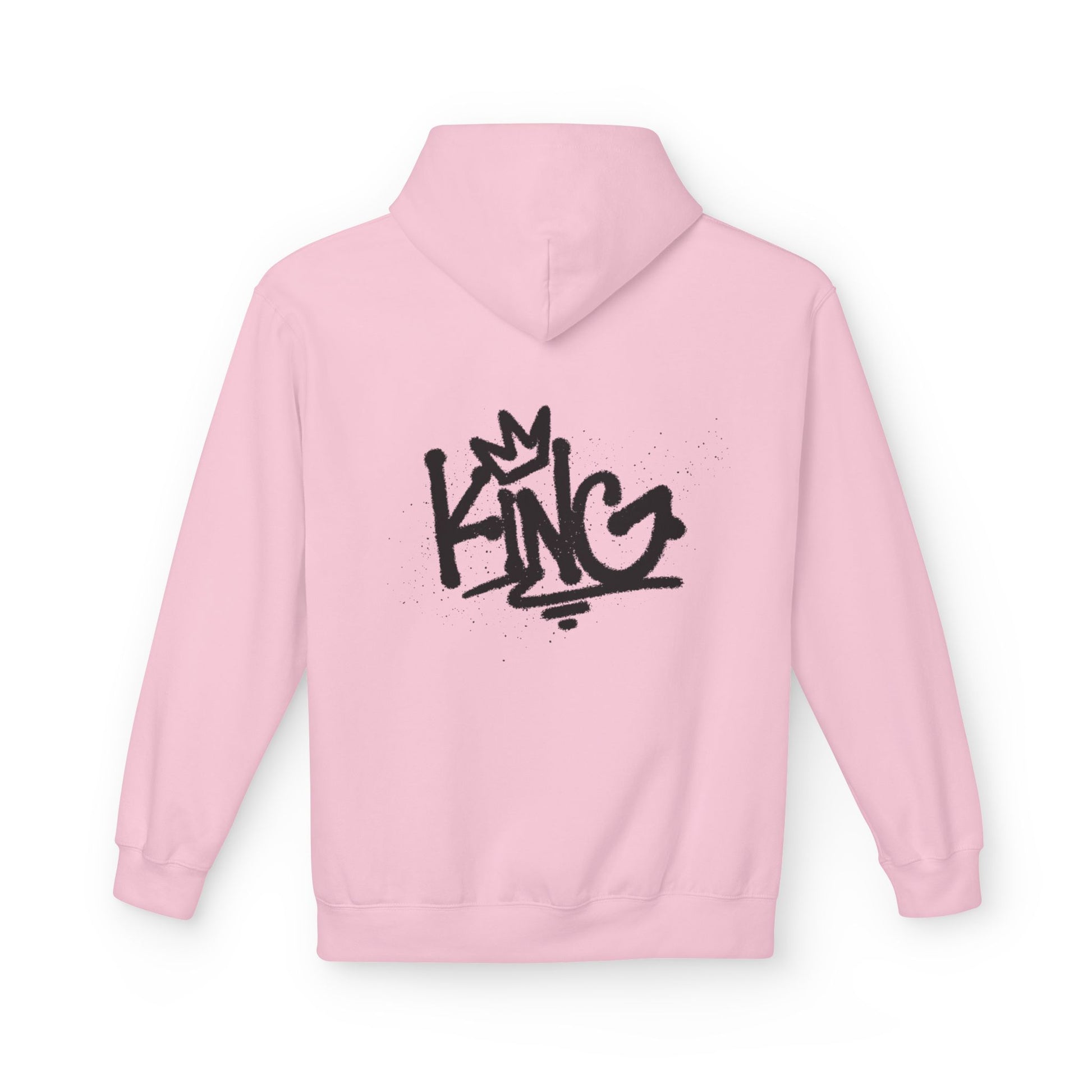 Lightweight yet substantial, this midweight hoodie carries an urban edge — a soft, breathable cotton blend with a relaxed drop-shoulder silhouette and a lined two-piece hood for added warmth. The front bears a small, hand-sketched crown emblem over the heart; the back shows a bold, graffiti-style “KING” tag with subtle splatter details, like a personal street signature. It slips on easily, pockets your hands (and your essentials) in the pouch pocket, and feels worn-in without losing structure. Ethically made and OEKO-TEX certified, it’s built for people who value craft, conscience, and unmistakable street style.