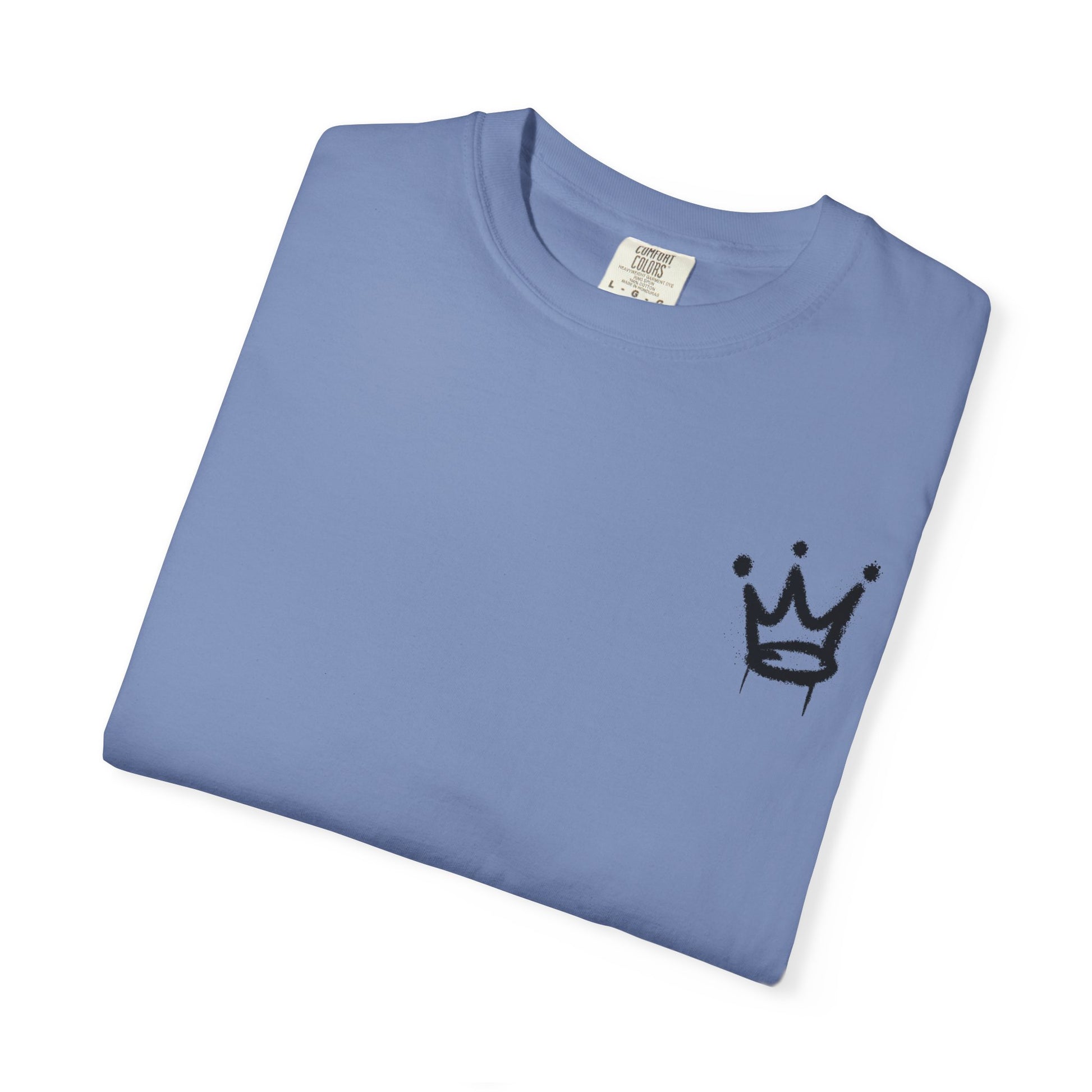 A relaxed, garment-dyed tee that feels lived-in from the first wear. The soft, broken-in cotton carries a minimalist, hand-drawn crown on the chest and a bold pair of tumbling dice across the back — small details that speak to playful confidence and nights that blur luck with skill. Wear it to keep things casual but expressive: layered under a jacket for a bar night, thrown on for a long drive, or worn around the table when the stakes are friendly and high. The muted, dyed color and tubular knit give the shirt an understated, vintage vibe that ages beautifully with every wash and adventure.