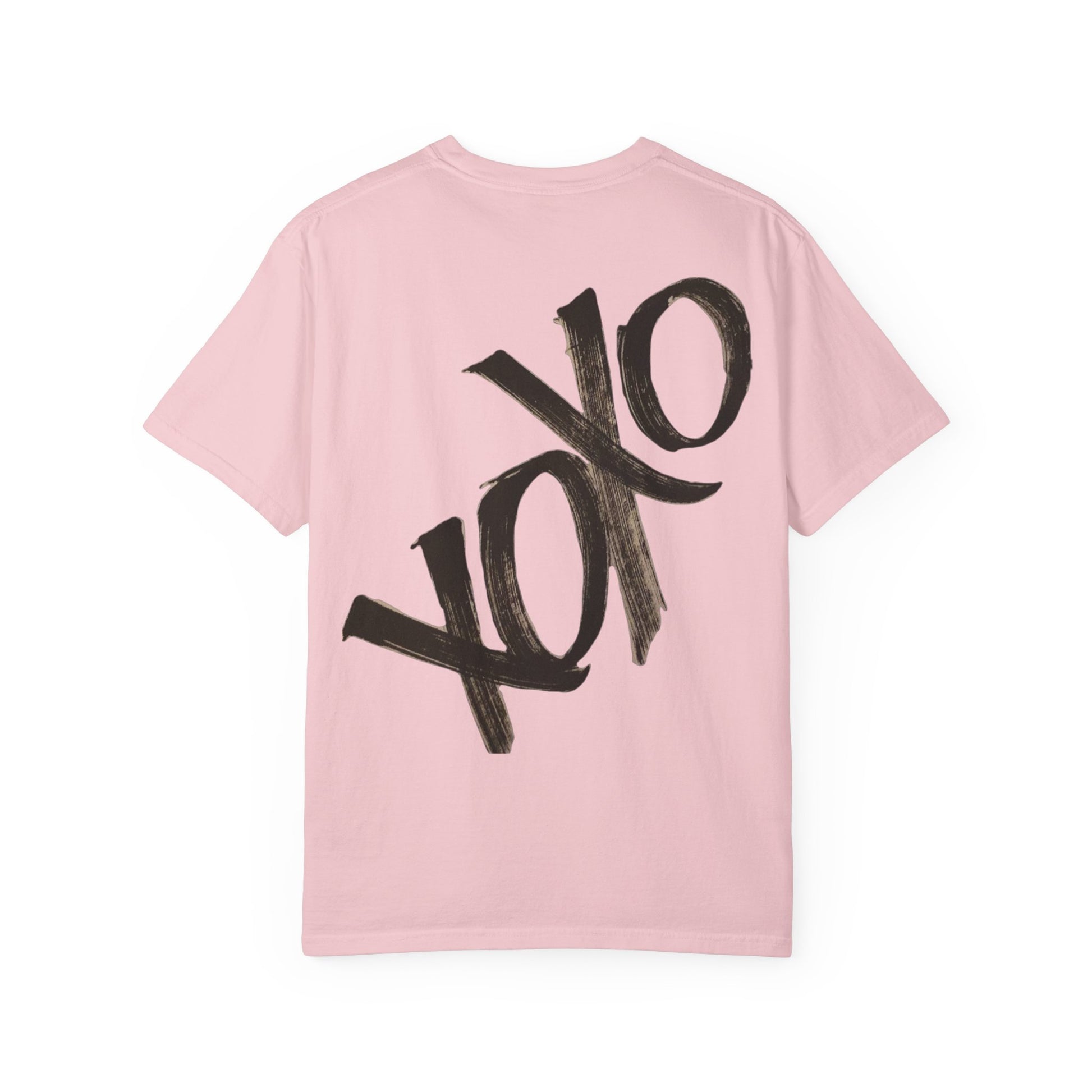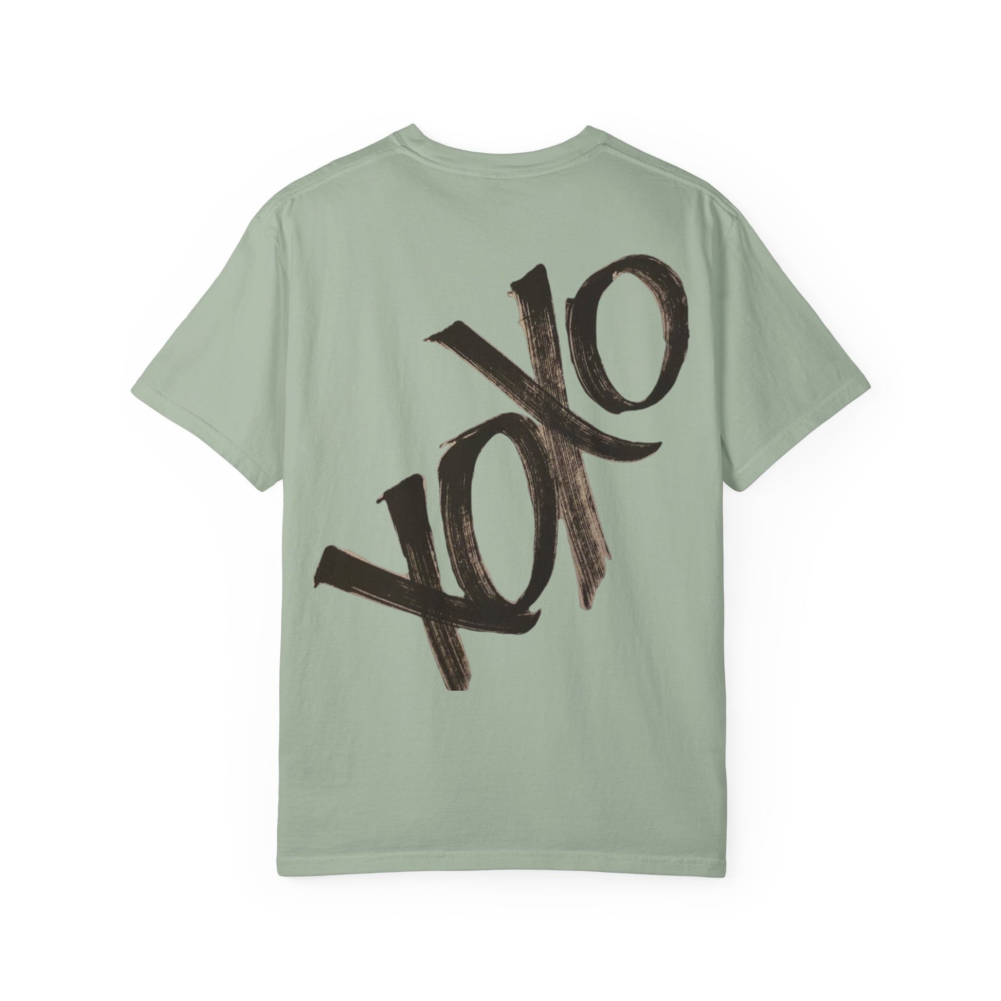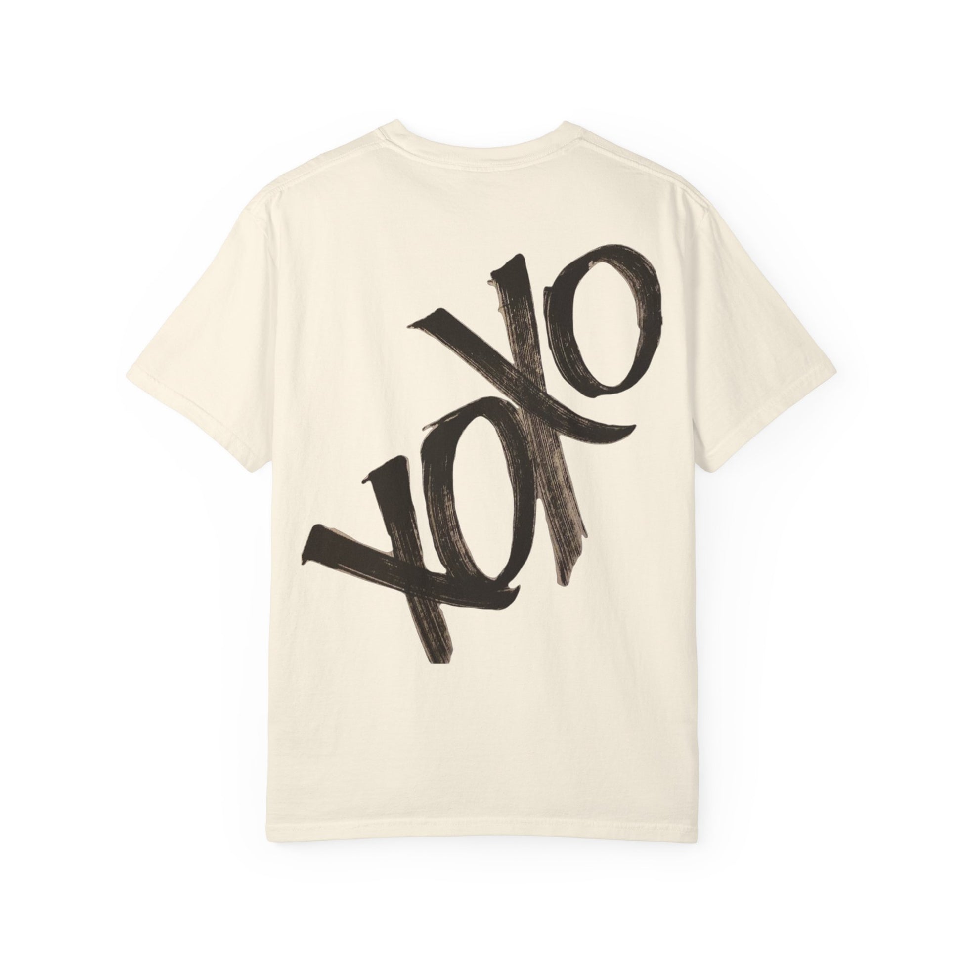 A soft, garment-dyed cotton tee with a relaxed fit and hand-painted attitude. The front bears a small, sketched crown over the heart; the back strikes a bold, brushstroke “XOXO” that reads like a quick, affectionate signature. Lightweight but sturdy, the shirt settles in with a lived-in feel from first wear and keeps its shape thanks to double-needle stitching and pre-shrunk, ring-spun cotton. Wear it layered under a jacket, with jeans on a coffee run, or as your go-to around-town shirt when you want something that feels personal rather than mass-produced. The subtle crown detail gives a nod to confidence while the oversized, painterly XOXO turns every exit into a little statement — casual, expressive, and quietly made to last.